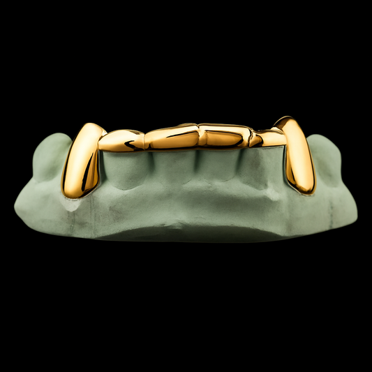 Custom 2 Teeth Fangs With Front Bar Gold Grillz
