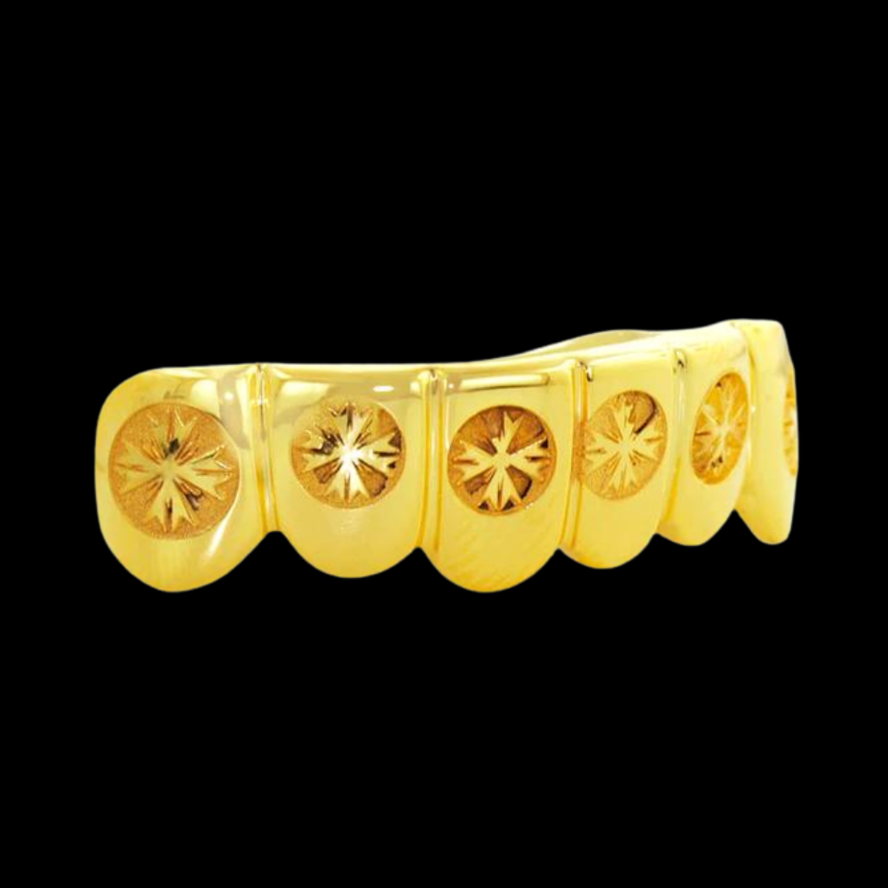 6 engraved teeth in 10k yellow gold with any design or logo of your choice. | |