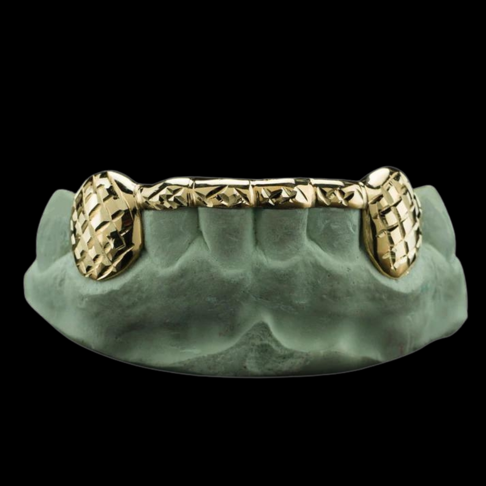 Custom 2 Teeth Diamond Cut and Diamond Dust Grillz with Front and Back Bar Gold Grillz