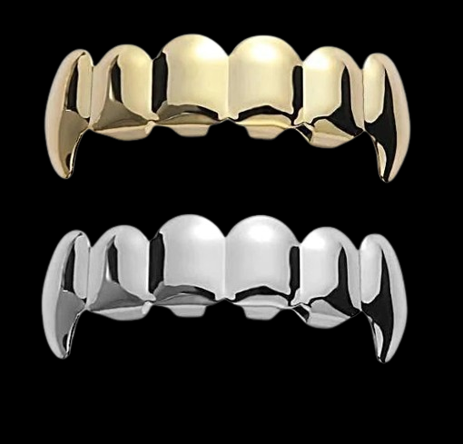 Iced out Teeth Hip Hop Grillz at incredibly low wholesale prices available in Rhodium and Gold plating color in an acrylic box and wax/mold for one size fit all options. Solid construction and solid plating made for fashion use