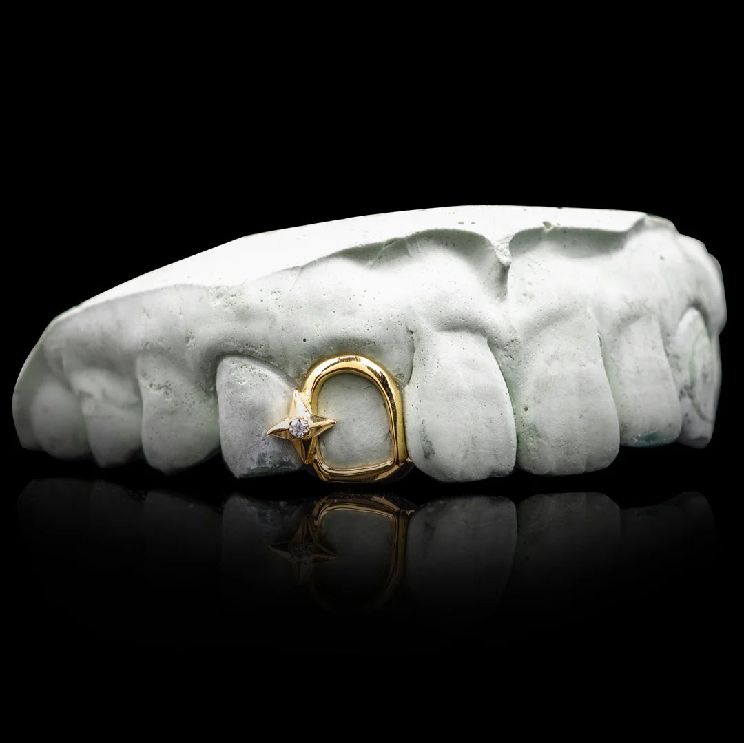 This custom-made grillz features a sleek open-face design crafted from solid gold or sterling silver, with a dazzling VVS Moissanite stone set in a handcrafted star. It's designed for those who love subtle yet bold statement pieces, enhancing your natural smile while keeping things stylish. The grillz is compression fit, with slight pressure to keep it in place on your teeth. Custom made to the exact shape of your teeth based on your molds.