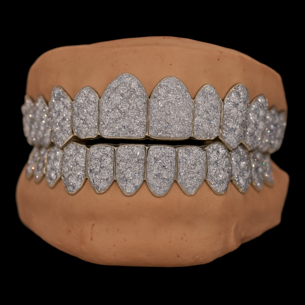 Custom Grillz Hand Set Moissanite Diamonds Top OR Bottom. These stunning pieces are a true work of art, featuring Moissanite diamonds of the finest quality and hand-set with the utmost attention to detail.