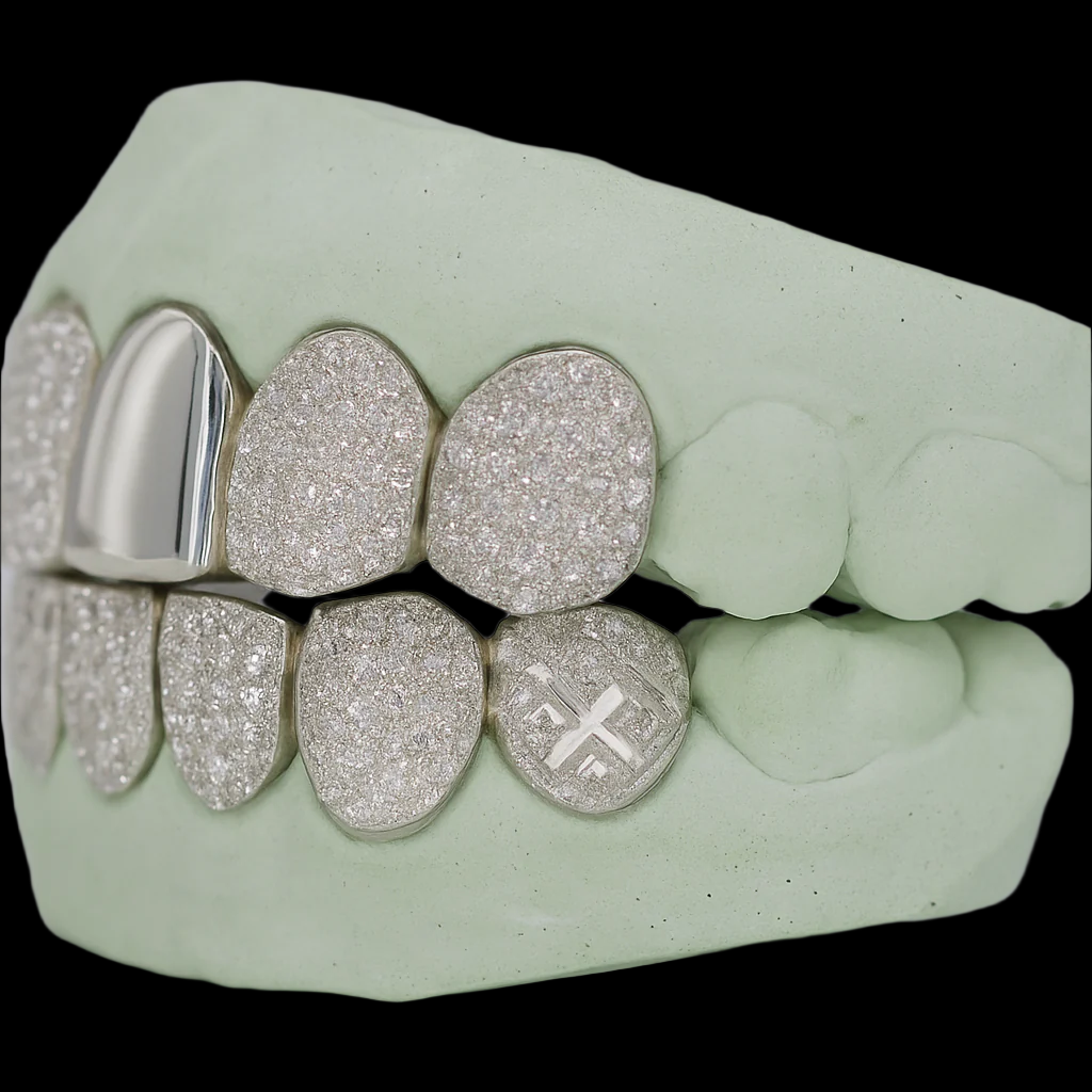 Custom Grillz Hand Set Moissanite Diamonds Top OR Bottom. These stunning pieces are a true work of art, featuring Moissanite diamonds of the finest quality and hand-set with the utmost attention to detail.
